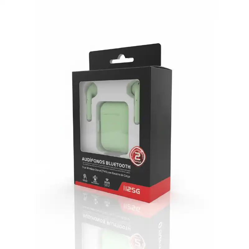 Audífonos Bluetooth i12S en color verde, diseñados para brindar comodidad y libertad inalámbrica. Ofrecen sonido claro, conexión estable y control táctil para reproducir música o atender llamadas, siendo ideales para el uso diario con carga rápida desde su estuche portátil.