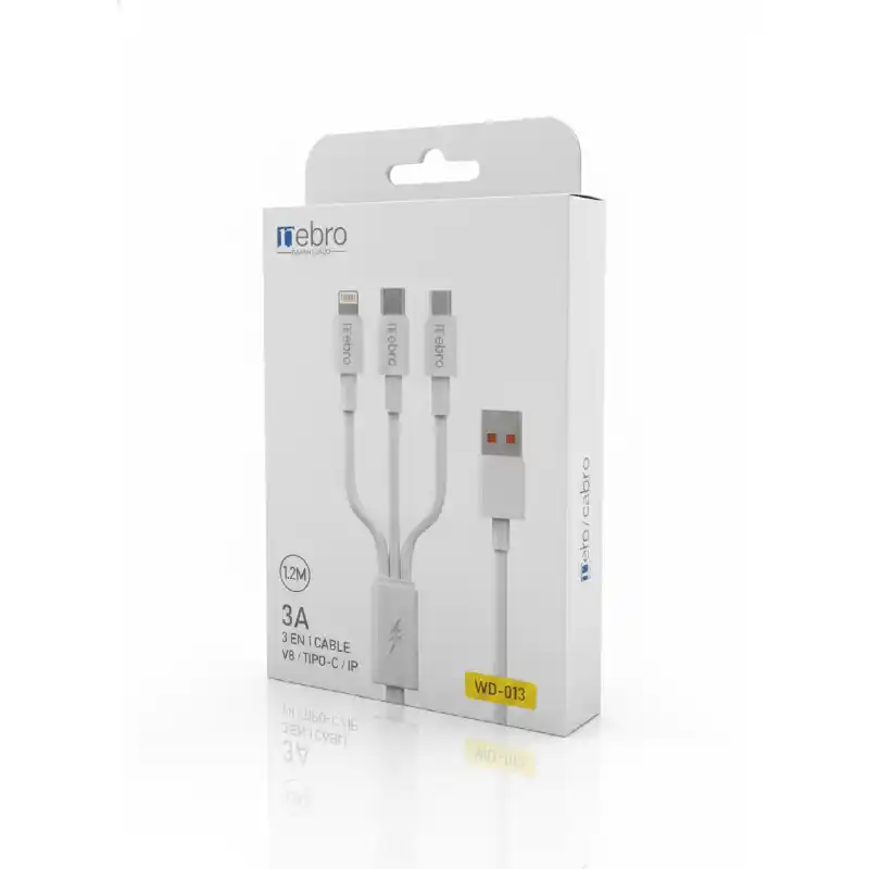 El cable de carga con triple salida V8/Tipo C/Lightning es una solución versátil que permite cargar y transferir datos entre distintos dispositivos. Su diseño multifuncional integra tres tipos de conectores, brindando compatibilidad con una amplia variedad de equipos.