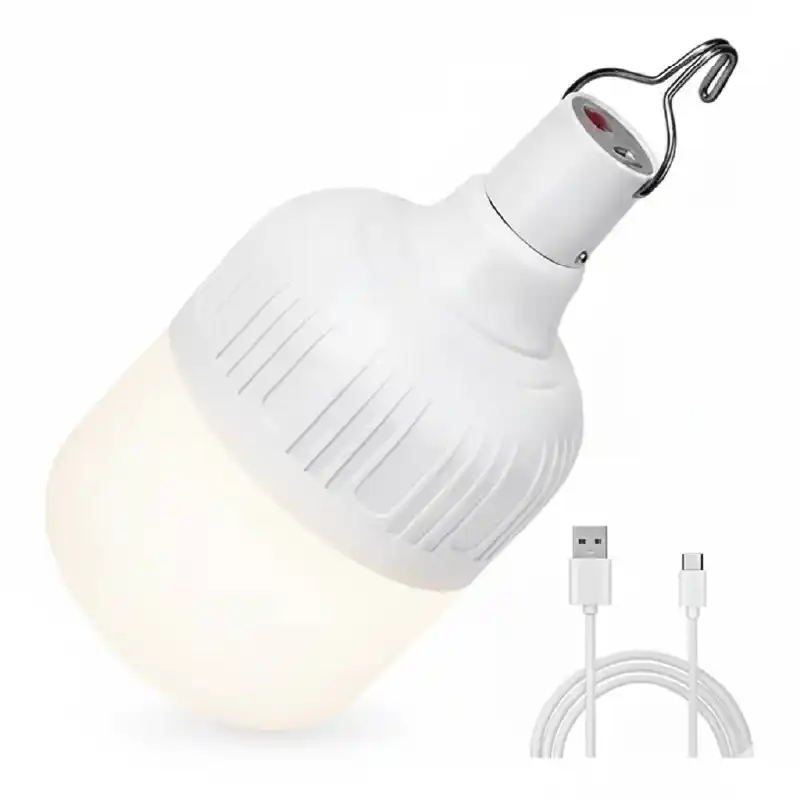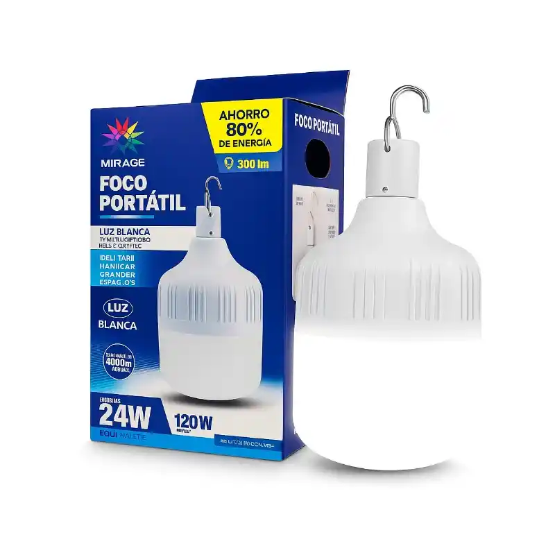 Esta es una lámpara LED portátil, diseñada para ser utilizada como foco de emergencia o luz auxiliar en diversos entornos. El dispositivo tiene un diseño robusto y completamente blanco, tiene una potencia de 24W y un ahorro del 80% de energía. Incorpora un gancho metálico en la parte superior para facilitar su suspensión. Este producto emite luz blanca y es ideal para uso en campamentos, talleres o cortes de energía.