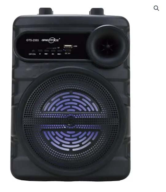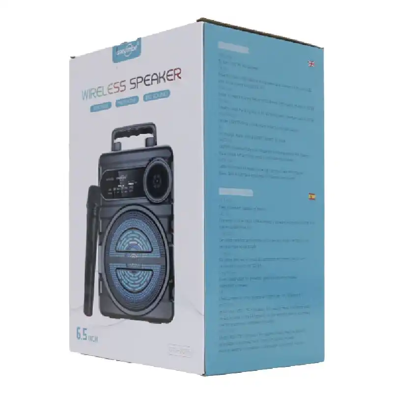 Bocina Bluetooth de 6.5 pulgadas con micrófono inalámbrico integrado, diseñada para ofrecer sonido potente y claro en cualquier espacio. Permite reproducir música de forma inalámbrica, siendo ideal para reuniones, fiestas o uso personal.
