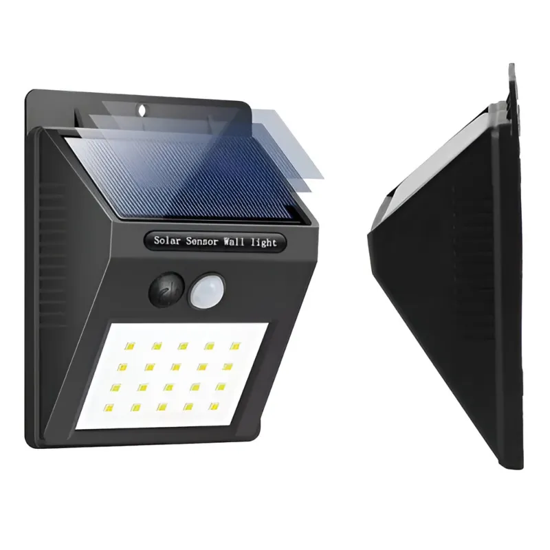 Esta lámpara de pared para exteriores opera con energía solar, diseñada para proporcionar iluminación de seguridad o emergencia. El dispositivo de color negro tiene un panel solar ajustable en la parte superior para maximizar la absorción de luz y una rejilla inferior con múltiples luces LED. Además, incorpora sensores, incluyendo un sensor de movimiento, para una activación automática y eficiente, lo que la convierte en una solución de iluminación exterior práctica y autónoma.
