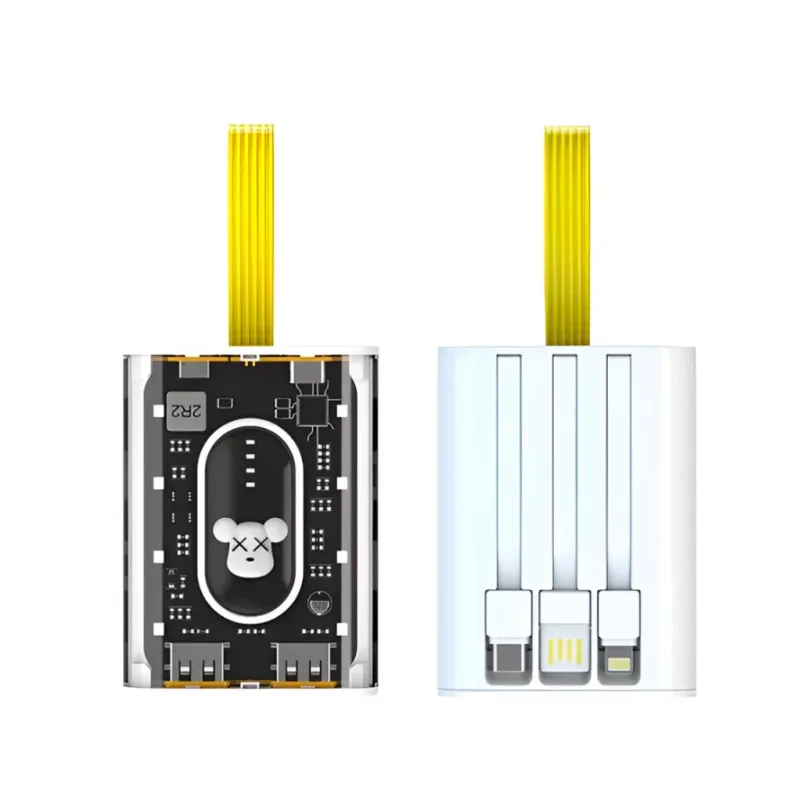 Esta batería portátil combina un estilo vanguardista con la máxima funcionalidad. Su diseño frontal transparente permite ver los circuitos internos, dándole un aspecto tecnológico único, mientras que en la parte posterior incluye tres cables de carga integrados para cubrir todas tus necesidades sin cargar extras. Es la solución compacta y estética para mantener tus dispositivos siempre con energía.