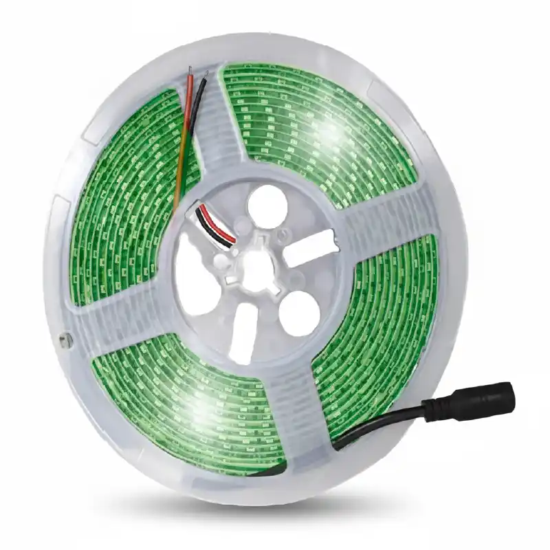 Tira LED verde de 5 metros, ideal para decorar espacios interiores y crear ambientes modernos y luminosos. Su instalación es sencilla y ofrece una iluminación intensa y duradera, perfecta para habitaciones, eventos o proyectos decorativos.