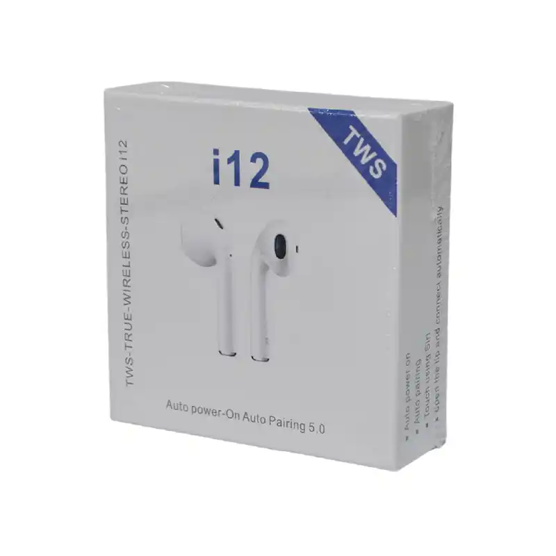 Audífono Bluetooth i12 con estuche de carga, diseñado para ofrecer comodidad y libertad inalámbrica. Brinda sonido claro, conexión estable y facilidad de transporte, permitiendo cargar los audífonos en cualquier momento gracias a su estuche portátil.