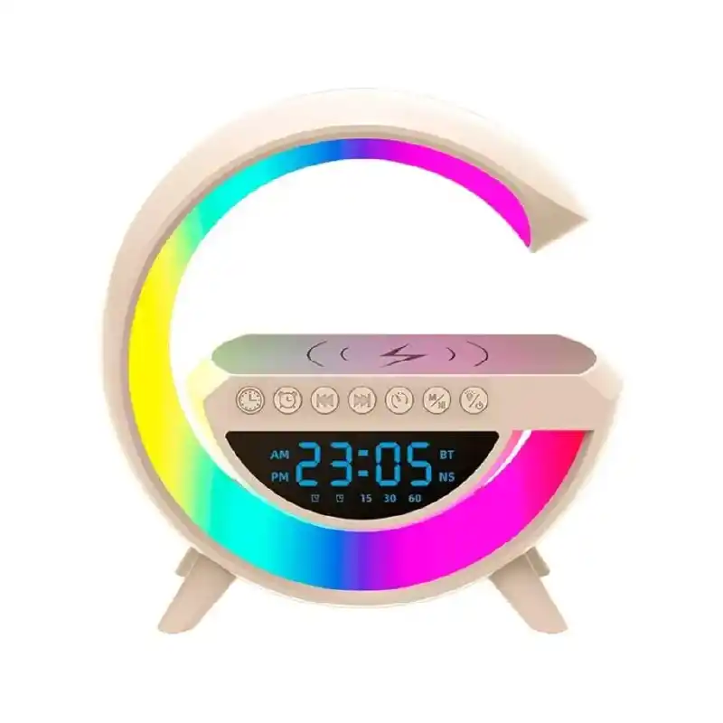 La bocina G con base de carga inalámbrica de 15W combina tecnología y estilo en un solo dispositivo. Incluye luz RGB, reloj digital y sonido potente, ideal para acompañar tu espacio con música, iluminación y funcionalidad.